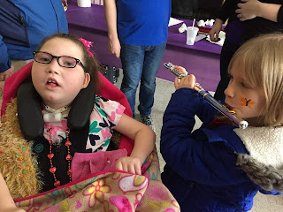 Quinn loved the violin, and I love how we continue to teach folks around us how disabilities are not going to stand in our way as much as possible. (just look at that knowledge we are sharing with the two kids in the background) :) So we got right in there and tried a few things out as well. The helpers did great and worked with us with such lovely excitement! Granted, I don't think it is going to work for her to play the violin next year, but I'm hoping she has a teacher who can let her ring a bell or play the hand drums for a small part of a song, to include her. We will see how much we can educate and how flexible and creative we can all be next year.
